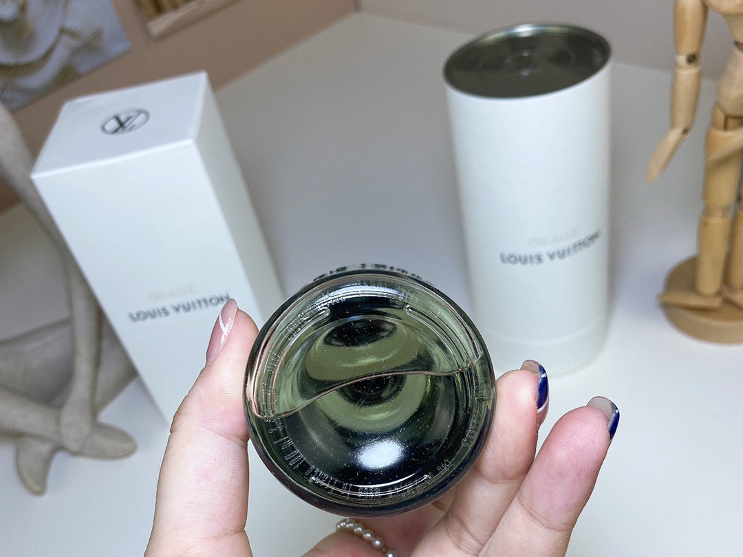 - Un flacon épuré : Fidèle à l’esthétique minimaliste de Louis Vuitton, le flacon met en avant le luxe discret et contemporain.